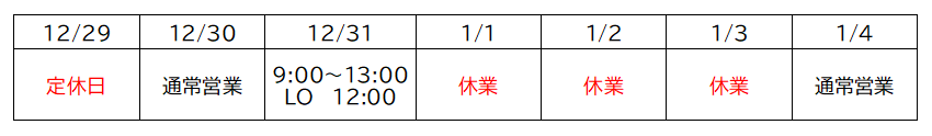 いつもご来店いただきありがとうございます。年末年始の営業日、時間についてお知らせをいたします。年末年始の期間は以下の通り営業させていただきます。1/4(日)以降は通常通りの営業をいたします。ご理解とご協力の程をよろしくお願い申し上げます。